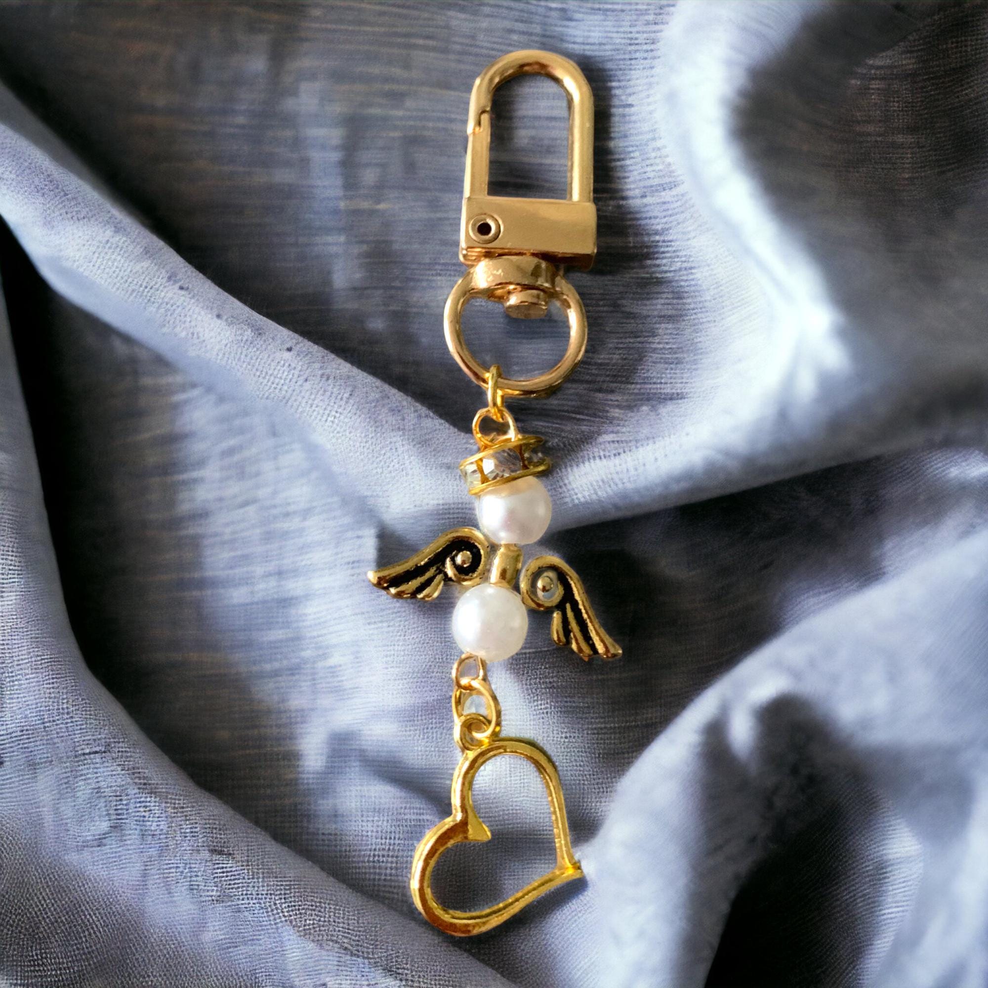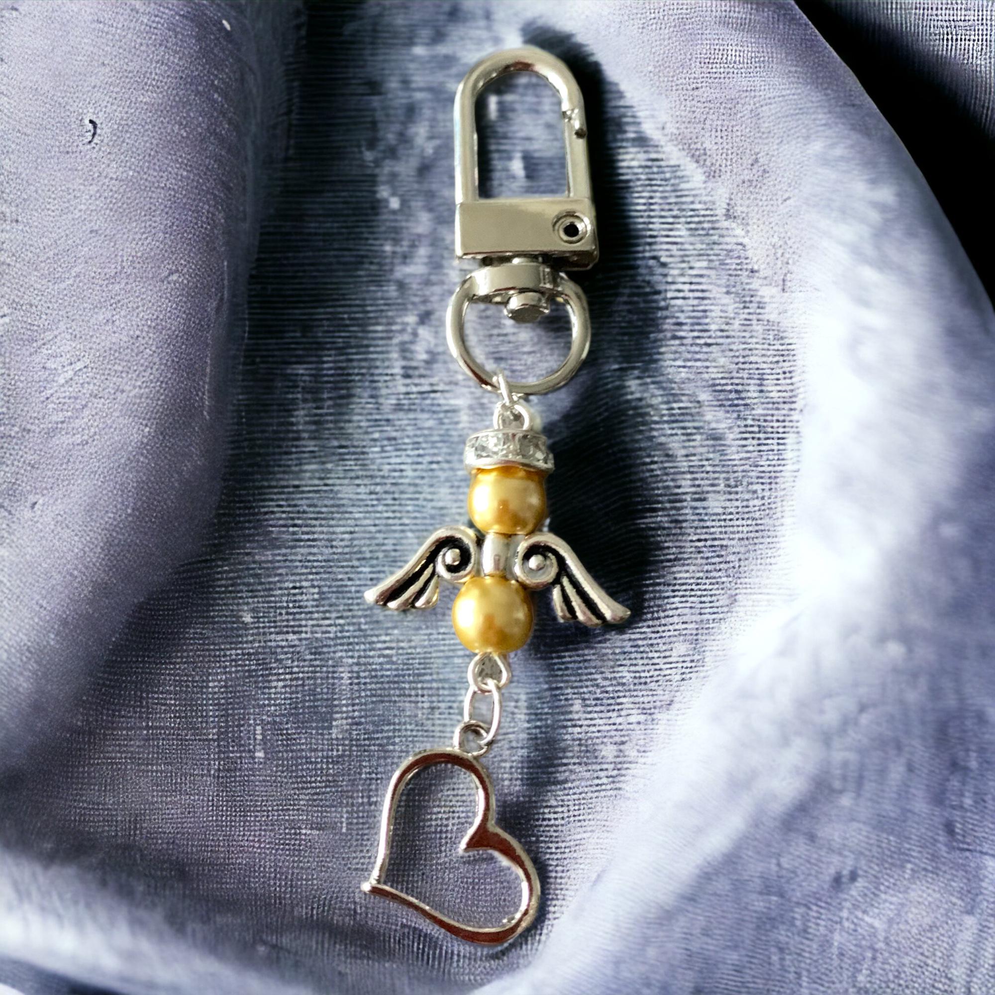 Mens Keychain, Beaded Keychain, Wood Beaded Keychain, Boho Tassel Keychain, Keychain, Backpack Accessory, Guardian Angel keychain with Coloured Pearls and a Heart Charm. Makes a great gift.